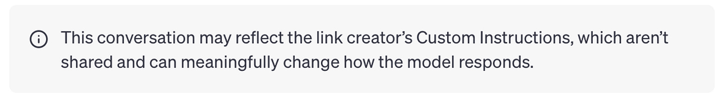 챗 공유 : Custom Instructions가 적용된 챗을 공유하는 경우 공유한 사람이 입력한 지침이 공유된 챗에도 여전히 적용돼 있습니다. (제가 위에서 공유드린 예시 링크들에서 확인해보세요! 공유된 링크에서 아래와 같은 메시지가 보이실 거에요!)