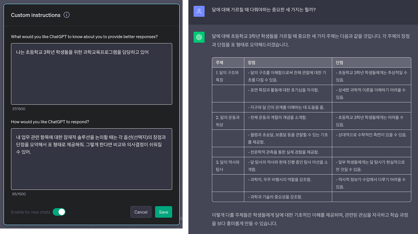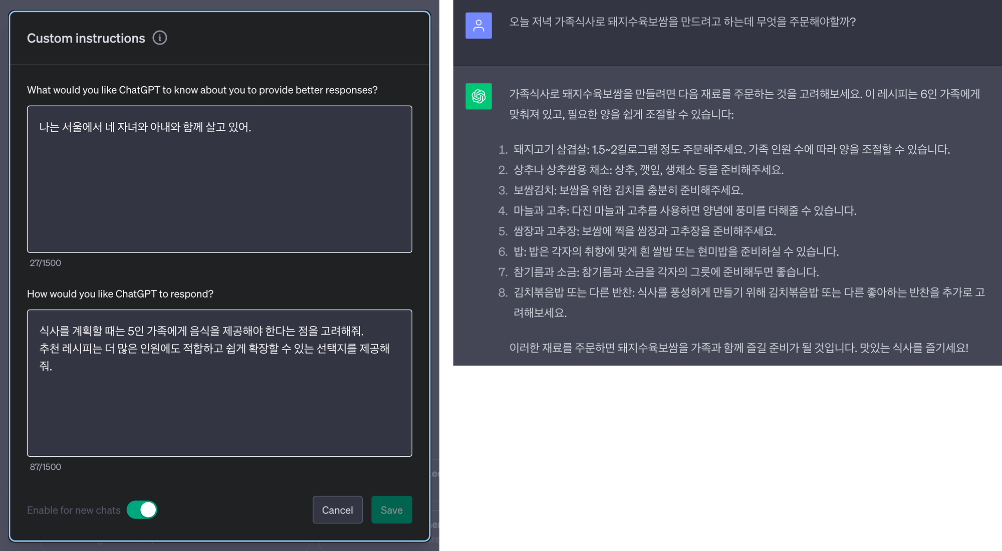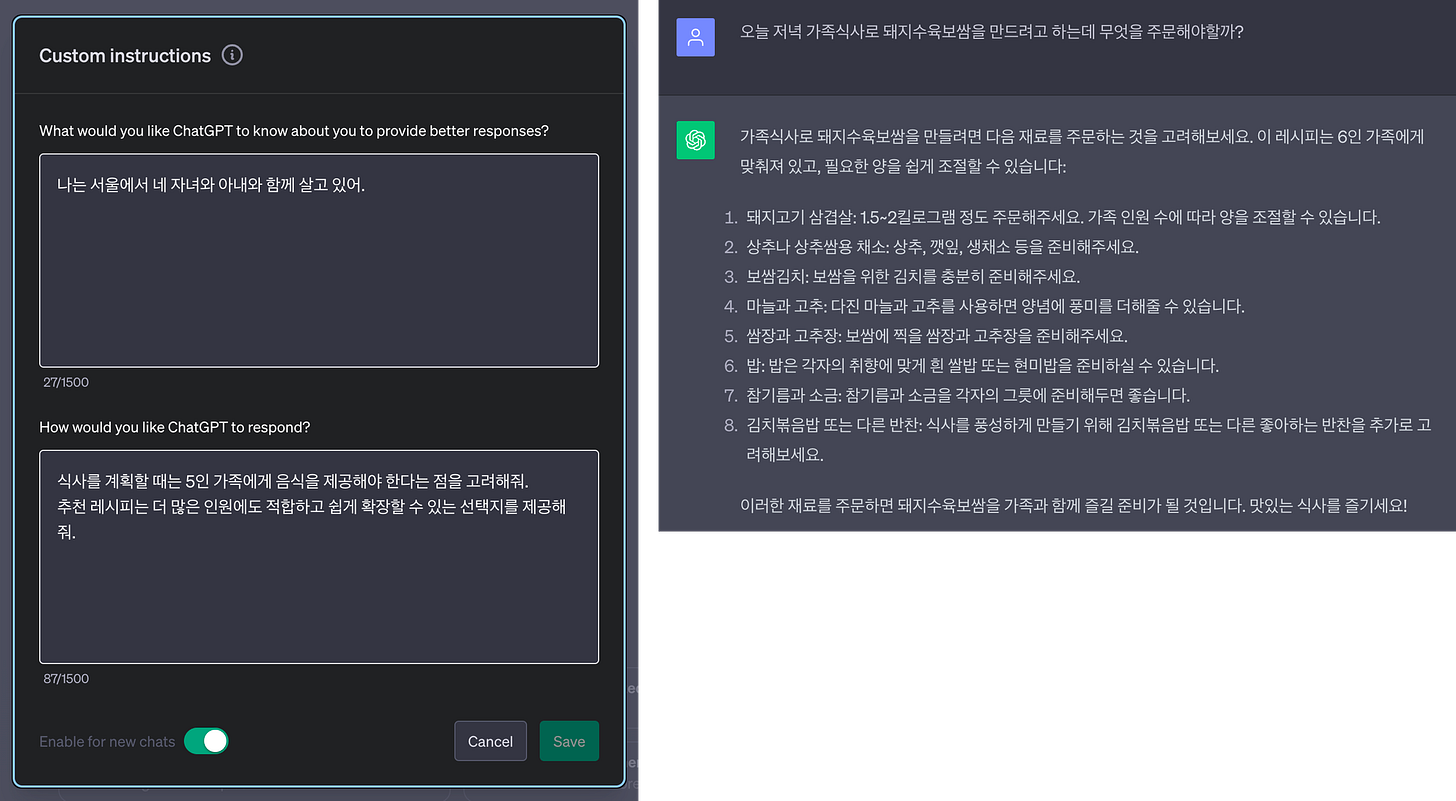 2번 화면의 Enable for new chats를 키면 새로 생성하는 챗에서 작성한 지침이 적용됩니다.