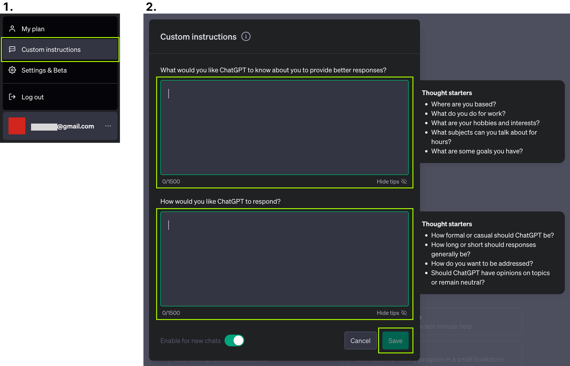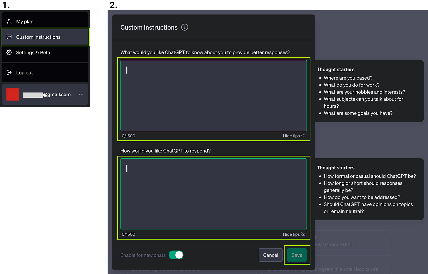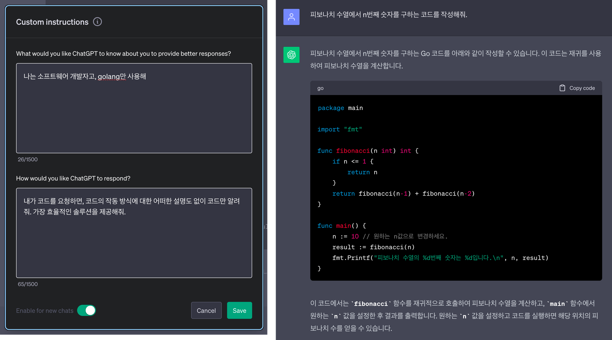 2번 화면의 Enable for new chats를 키면 새로 생성하는 챗에서 작성한 지침이 적용됩니다.